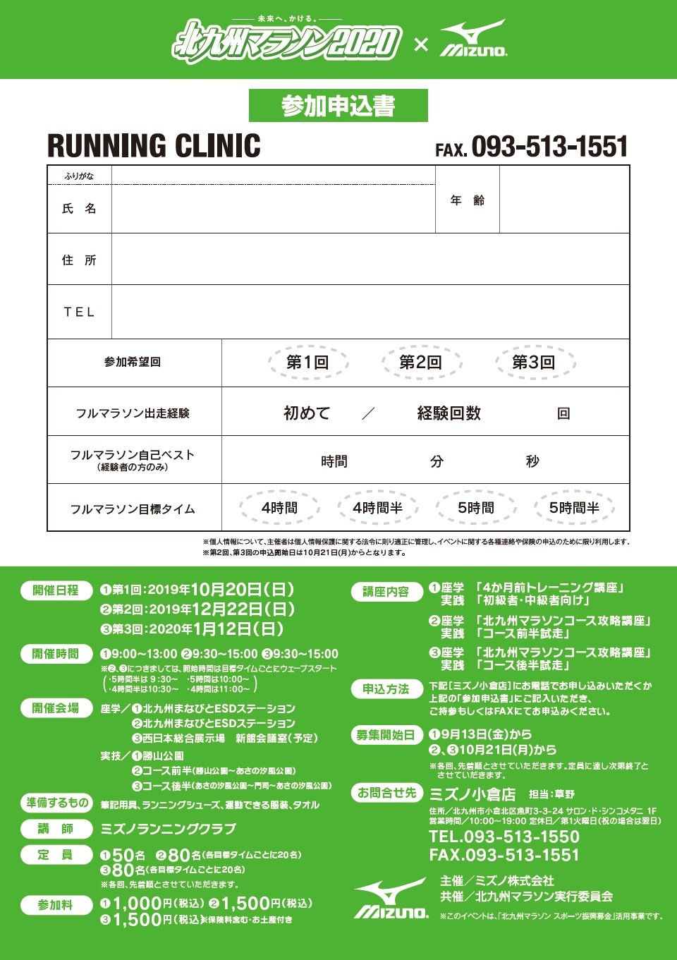 ミズノ小倉店へ、お電話でお申込みいただくか、「参加申込書」にご記入いただき、ご持参もしくはFAXでお申込みください。
