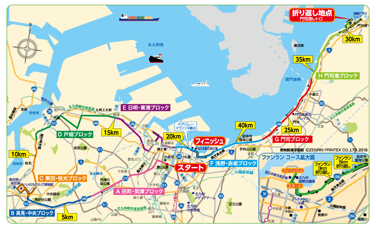 | A 田町・到津ブロック | 8:00~10:30 | コース設営・整理、ランナー救護、距離表示、給水・給食、トイレ管理 等 ※田町・到津ブロックには、給水・給食がありません。 ※浅野・赤坂ブロックでは、ペアリレーマラソン中継点での活動を含みます。 ※戸畑ブロックのみ、う回路案内があります。 |